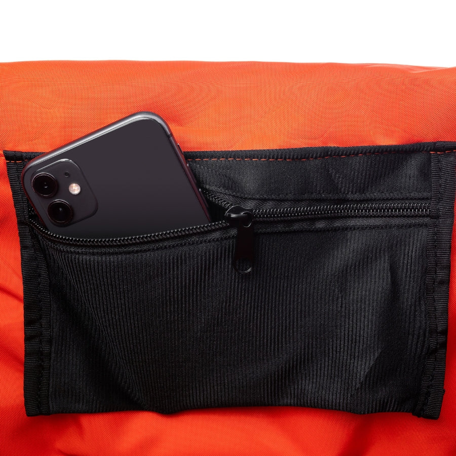 The main compartment's smart flap design allows for easy access and visibility of all contents at a glance, a clever alternative to a traditional zipper. Inside, there are three different pockets – one mesh, one netting, and one waterproof – providing versatile storage options for phones and accessories.